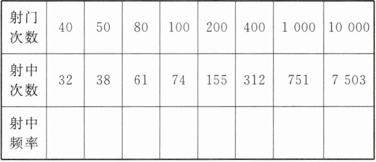 (3)根据频率的稳定性,估计该足球队射中球门的概率(精确到0.01).
