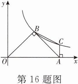 16. [模型观念]如图,$\triangle AOB$是等腰直角三角形,$\angle ABO= 90°$,反比例函数$y= \dfrac{k}{x}(k>0,x>0)$的图象经过点B,过点$A(4,0)$作x轴的垂线,交反比例函数的图象于点C,连接BC.