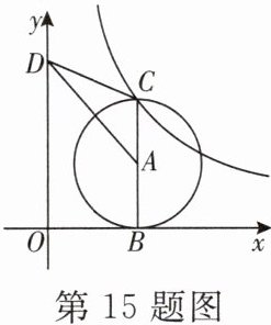 15. 如图,在平面直角坐标系中,$\odot A$与x轴相切于点B,CB为$\odot A$的直径,点C在函数$y= \dfrac{k}{x}(k>0,x>0)$的图象上,D为y轴上一点,$\triangle ACD$的面积为6,求k的值.