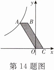 14. 如图,反比例函数$y= \dfrac{k}{x}(x<0)$的图象经过平行四边形ABCO的顶点A,OC在x轴上,若点$B(-1,3)$,$S_{□ ABCO}= 3$,则实数k的值为