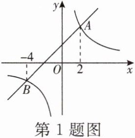 1. 如图,一次函数$ y_{1}= k_{1}x+b(k_{1}>0) 与反比例函数 y_{2}= \frac{k_{2}}{x}(k_{2}>0) $的图象相交于A,B两点,点A的横坐标为2,点B的横坐标为-4.当$ y_{1}<y_{2} $时,x的取值范围是( )