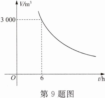 9. 工作人员对一蓄水池进行排水,每小时的排水量V(单位:$m^3)$与排完水池中的水所用的时间t(单位:h)之间满足如图所示的反比例函数关系.