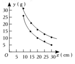 10. 在实验课上,小明做了一个试验. 如图1,在仪器左边托盘A(固定)中放置一个物体,在右边托盘B(可左右移动)中放置一个可以装水的容器,容器的质量为5 g. 在容器中加入一定质量的水,可以使仪器左右平衡. 改变托盘B与点C的距离x(单位:cm)(0<x≤60),记录容器中加入的水的质量,得到下表: