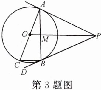 3. 如图,已知AC是⊙O的直径,直线PA与⊙O相切于点A,直线PD经过⊙O上的点B且∠CBD= ∠CAB,连接OP交AB于点M.