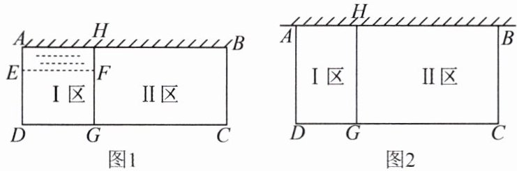 (1)方案一:如图1,全部利用围墙的长度,但要在Ⅰ区中留一个宽度AE= 1 m的水池,且需保证总种植面积为$32 m^2,$试分别确定CG,DG的长.
