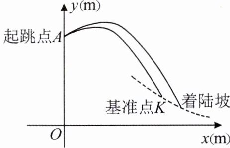 8. 跳台滑雪运动可分为助滑、起跳、飞行和落地四个阶段,运动员起跳后飞行的路线是抛物线的一部分(如图中实线部分所示),落地点在着陆坡(如图中虚线部分所示)上,着陆坡上的基准点K为飞行距离计分的参照点,落地点超过点K越远,飞行距离分越高.2022年北京冬奥会跳台滑雪标准台的起跳台的高度OA为66m,基准点K到起跳台的水平距离为75m,高度为hm(h为定值).设运动员从起跳点A起跳后的高度y(m)与水平距离x(m)之间的函数关系为$y= ax^{2}+bx+c(a≠0)$.