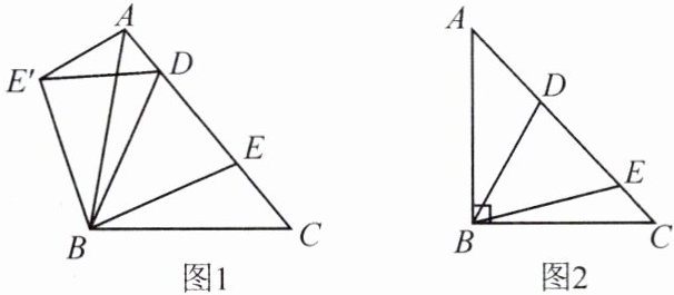 10.(1)如图1,在△ABC中,BA= BC,D,E是AC边上的两点,且满足∠DBE= $\frac{1}{2}$∠ABC(0°<∠CBE<$\frac{1}{2}$∠ABC).以点B为旋转中心,将△BEC按逆时针方向旋转∠ABC,得到△BE'A(点C与点A重合,点E到点E'处),连接DE'.求证:DE'= DE.