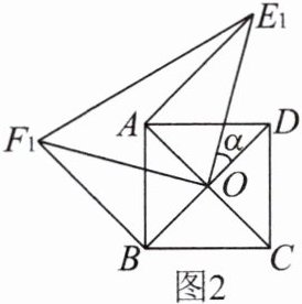9.如图1,O为正方形ABCD的中心,分别延长OA,OD到点F,E,使OF= 2OA,OE= 2OD,连接EF.将△EOF绕点O逆时针旋转α角得到$△E_1OF_1($如图2).
