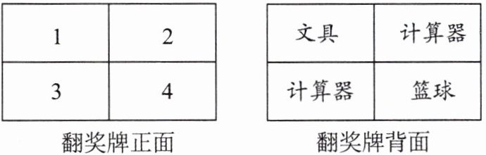 9. 在某班“讲故事”比赛中有一个抽奖活动,活动规则是:只有进入最后决赛的甲、乙、丙三位同学,每人才能够获得一次抽奖机会.在如图所示的翻奖牌正面的4个数字中选一个数字,选中后就可以得到该数字后面的相应奖品:前面的人选中的数字,后面的人就不能再选择了.