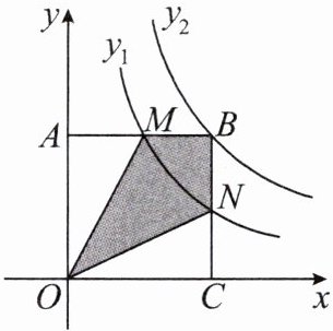 9.如图,矩形OABC与反比例函数$y_1= \frac{k_1}{x}$($k_1$是非零常数,$x>0$)的图象交于点M,N,与反比例函数$y_2= \frac{k_2}{x}$($k_2$是非零常数,$x>0$)的图象交于点B,连接OM,ON.若四边形OMBN的面积为3,则$k_1-k_2= $( )