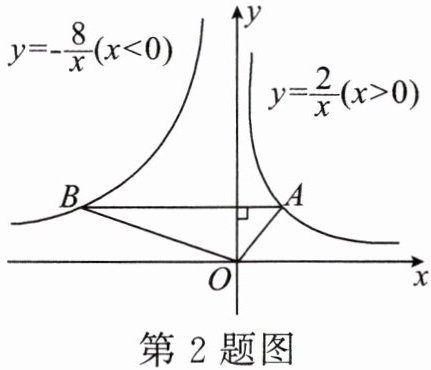 2. 如图,在函数$ y= \frac{2}{x}(x>0) 的图象上任取一点 A $,过点$ A 作 y 轴的垂线交函数 y= -\frac{8}{x}(x<0) 的图象于点 B $,连接$ OA $,$ OB $,则$ \triangle AOB $的面积是( )