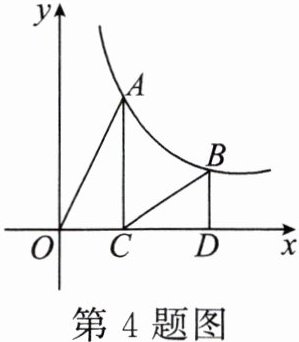 4. 如图,点$ A $,$ B 是反比例函数 y= \frac{k}{x}(x>0) $图象上的两点,过点$ A $,$ B 分别作 AC\perp x 轴于点 C $,$ BD\perp x 轴于点 D $,连接$ OA $,$ BC $.已知点$ C(2,0) $,$ BD= 2 $,$ S_{\triangle BCD}= 3 $,则$ S_{\triangle AOC}= $______.