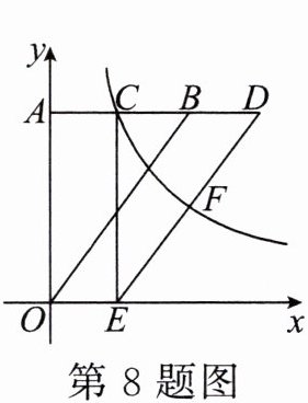8. 如图,在平面直角坐标系$ xOy $中,点$ A(0,4) $,$ B(3,4) $,将$ \triangle ABO 向右平移到 \triangle CDE $位置,$ A 的对应点是 C $,$ O 的对应点是 E $,函数$ y= \frac{k}{x}(k\neq0) 的图象经过点 C 和 DE 的中点 F $,则$ k $的值是______.