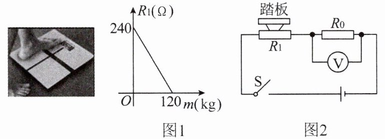 11.电子体重秤读数直观又便于携带,为人们带来了方便.某综合实践活动小组设计了简易电子体重秤:制作一个装有踏板(踏板质量忽略不计)的可变电阻R_1,R_1与踏板上人的质量m之间的函数关系式为R_1= km+b(其中k,b为常数,0≤m≤120),其图象如图1所示;图2的电路中,电源电压恒为8伏,定值电阻R₀的阻值为30欧,接通开关,人站上踏板,电压表显示的读数为U₀,该读数可以换算为人的质量m,温馨提示:①导体两端的电压U,导体的电阻R,通过导体的电流I,满足关系式I= $\frac{U}{R}$;②串联电路中电流处处相等,各电阻两端的电压之和等于总电压.