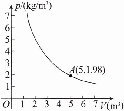 10.密闭容器内有一定质量的二氧化碳,当容器的体积$V(m^3)$变化时,气体的密度$ρ(kg/m^3)$随之变化.已知密度ρ与体积V是反比例函数关系,它的图象如图所示,当$V= 5 m^3$时$,ρ= 1.98 kg/m^3.$