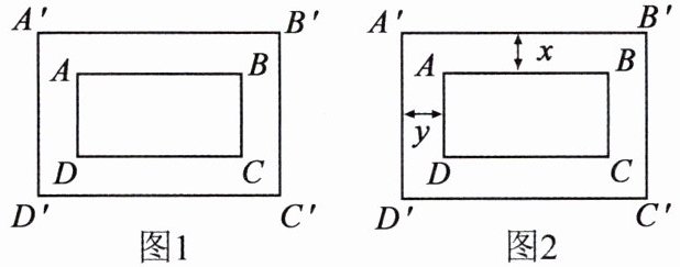 (2)如图2,如果相对着的两条小路的宽均相等,试问小路的宽x与y的比值为多少时,能使小路四周所围成的矩形$A'B'C'D'$和矩形ABCD相似?请说明理由.