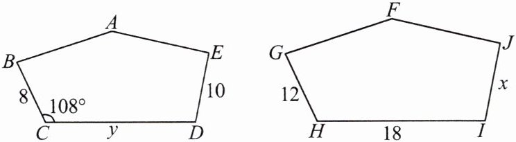 ∴∠H=∠C=108°, $\frac{BC}{GH}$=$\frac{CD}{HI}$=$\frac{DE}{IJ}$,即$\frac{8}{12}$=$\frac{y}{18}$=$\frac{10}{x}$,解得x=15,y=12.