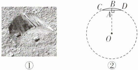 ·变式3:《九章算术》是中国传统数学的重要著作,奠定了中国传统数学的基本框架.《九章算术》中记载:"今有圆材,埋在壁中,不知大小,以锯锯之,深一寸,锯道长一尺(如图①),问径几何?"阅读完这段文字后,小智画出了一个圆柱截面示意图(如图②),其中$BO\perp CD于点A$,要求的是$\odot O$的直径.再次阅读后,发现$AB= $______寸,$CD= $______寸.(1尺$=10$寸)