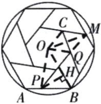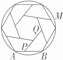 13. 下图是六个形状大小都相同的四边形围成一个圆的内接六边形和一个小正六边形. 若PQ 所在的直线经过点 M,PB= 5 cm,小正六边形的面积为$\frac{49\sqrt{3}}{2}$cm^2,则该圆的半径为______cm.
