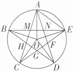 14. 如图,A,B,C,D,E 是⊙O 上的五等分点,分别连接 AC,CE,EB,BD,DA,可以得到一个五角星图形和五边形 MNFGH.