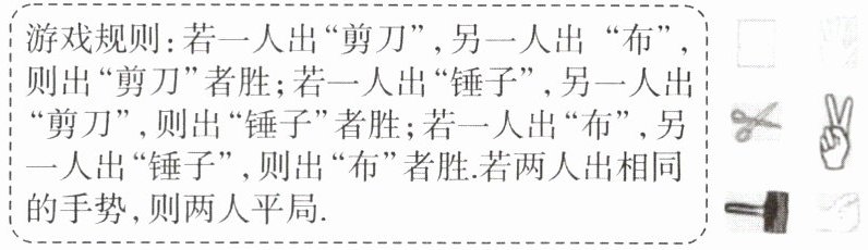 游戏规则:若一人出"剪刀",另一人出"布",则出"剪刀"者胜;若一人出"锤子",另一人出"剪刀",则出"锤子"者胜;若一人出"布",另一人出"锤子",则出"布"者胜.若两人出相同的手势,则两人平局.