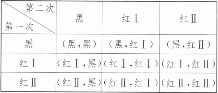 10. 一个布袋里放有1个黑球和2个红球,它们除颜色外其余都相同,从布袋里摸出1个球,记下颜色后放回,搅匀,再摸出1个球.将两个红球分别记为红Ⅰ、红Ⅱ,两次摸球的所有可能的结果如表所示,则两次摸出的都是红球的概率是______.