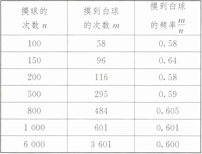 |摸球的次数n|摸到白球的次数m|摸到白球的频率$\frac{m}{n}$|