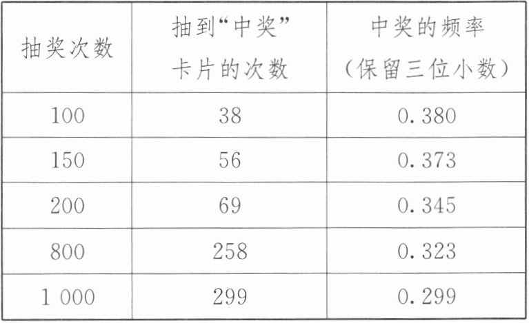 |抽奖次数|抽到"中奖"卡片的次数|中奖的频率(保留三位小数)|