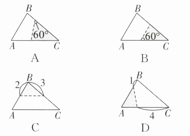 2. 如图,在△ABC中,∠A= 60°,AB= 4,AC= 6.将△ABC沿图示中的虚线剪开,剪下的三角形与△ABC不相似的是 ( )