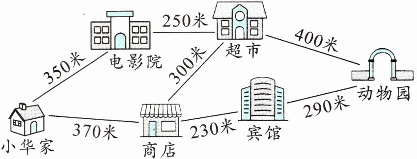 答:小华从家经过商店、宾馆到动物园最近,要走890米。