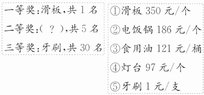 ③或④ 1000-350-1×30=620(元)121×5=605<620 97×5=485<620 答:可以选择③号或④号作为二等奖抽奖奖品。(答案不唯一,合理即可)