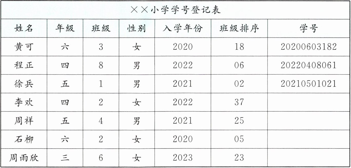 下面是某小学部分学生学号登记表,请你找一找学号的编排有什么规律,然后根据你找出的规律给没有学号的学生编上学号。