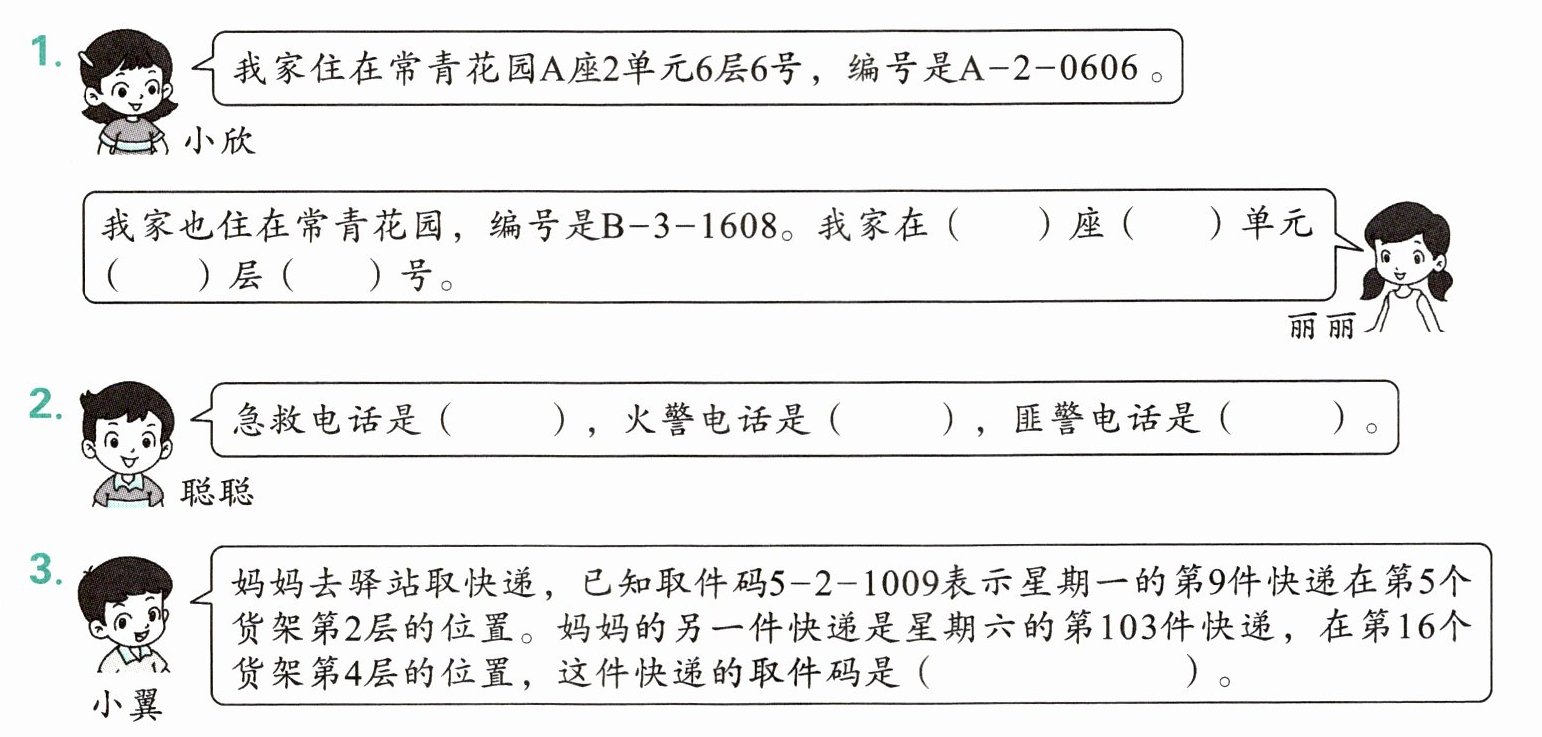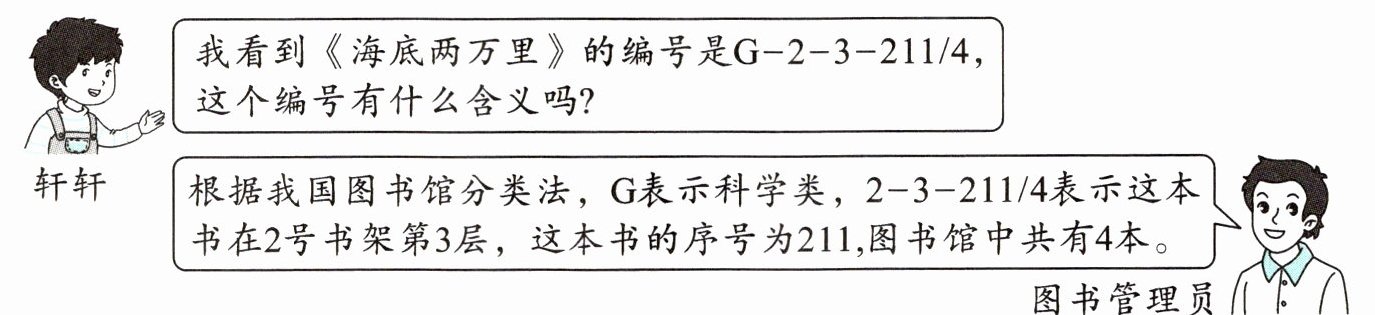 类,2 - 3 - 211/4 表示这本书在 2 号书架第 3 层,这本书的序号为 211,图书馆中共有 4 本。轩轩拿出一本从图书馆借回来的《昆虫记》,告诉大家编号为 G - 3 - 1 - 004/5,你知道这本书在图书馆的位置吗?图书馆中一共有几本呢?