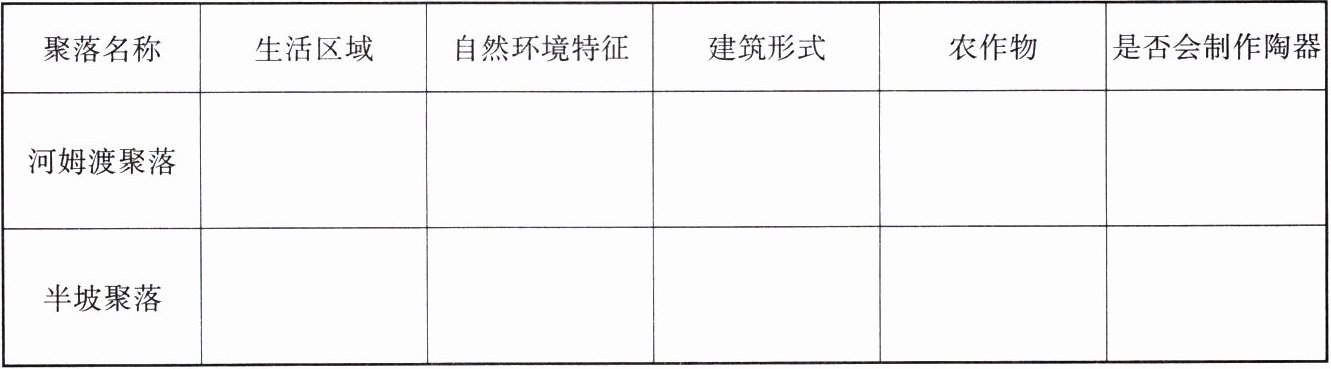 (3) 除了房屋结构,河姆渡聚落和半坡聚落还存在着许多其他差别,请根据教材内容,填写下表。