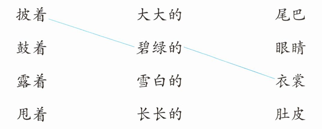 披着 大大的 尾巴 鼓着 碧绿的 眼睛 露着 雪白的 衣裳 甩着 长长的 肚皮