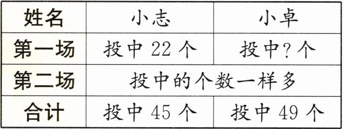 3. 丁岙(ào)杨梅产于温州市瓯海区,是杨梅中最好的鲜食品种,营养价值非常高。2024年瓯海区首届茶山杨梅文化节热闹非凡,不仅有杨梅特调饮品供游客品尝,还有乐队表演及游戏互动等环节。小志和小卓体验了"灌篮高手"游戏,两人一共进行了两场投篮游戏(成绩记录如下表)。第一场小卓投中了多少个球?