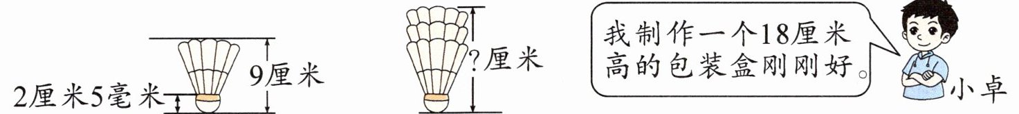 解析 叠在一起的3个羽毛球的高度实际上比一个羽毛球的要高出2个2厘米5毫米,只要用一个羽毛球的高度加上2个2厘米5毫米即可求出至少需要的包装盒的高度,再和小卓制作的包装盒高度比较即可。