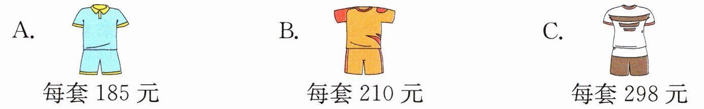3. 三年级将进行“大力神杯”足球赛。三(1)班陈老师采购4套价格相同的足球队服,她付给营业员9张100元。她买的可能是以下( )种足球队服。