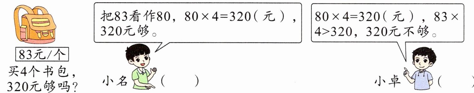 解析 1名老师和3名学生共4人,往返就是2趟,所以4人往返的实际总票价就是用单程票价291×4×2,把291看作300进行估算,可得300×4×2=2400(元),因为291<300,所以291×4×2<2400,则2400元购买往返高铁票够了。