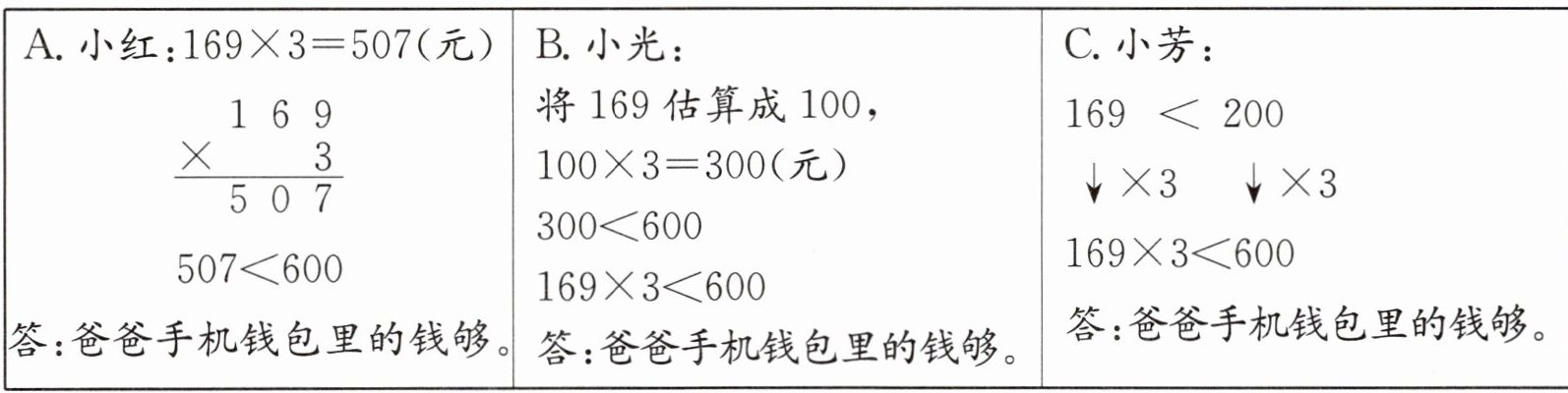 |A. 小红:169×3= 507(元) $\begin{array}{r} 169\\ ×\quad 3\\ \hline 507\end{array} $ 507<600 答:爸爸手机钱包里的钱够。| B. 小光:将169估算成100,100×3= 300(元) 300<600 169×3<600 答:爸爸手机钱包里的钱够。| C. 小芳:169<200 ↓×3 ↓×3 169×3<600 答:爸爸手机钱包里的钱够。|
