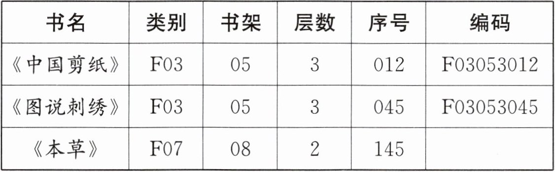 1. 图书馆新购买了一批“非遗”相关书籍,准备将馆内此类书籍重新分类整理、编码上架。下面是部分类别书籍的编码情况,请尝试编出书籍《本草》的编码。
