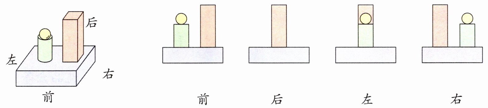 2. 下面左边的立体图形是小锦利用学具搭出来的,右边的四个图形分别是她在不同位置看到的,请你把正确的位置与图形连起来。