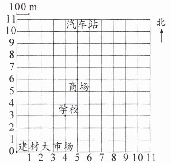 (1)建材大市场的位置用数对(0,0)表示,请在图中标出下面各地点的位置。