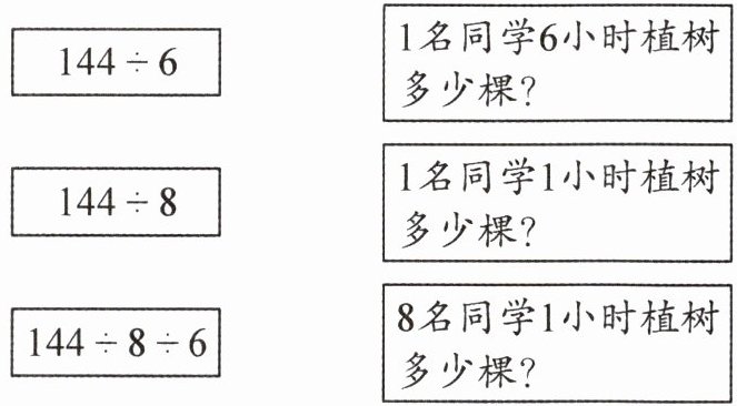 1. 开展植树造林活动。8名同学6小时植树144棵。根据以上条件,把算式与所对应的问题连一连。