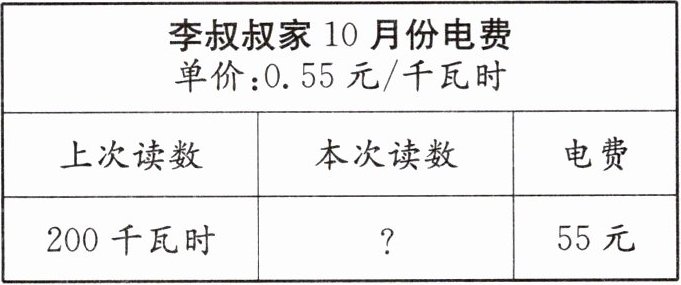 (2)解:设李叔叔家本次的电表读数是x千瓦时。(x-200)×0.55=55 x=300 答:李叔叔家本次的电表读数是300千瓦时。