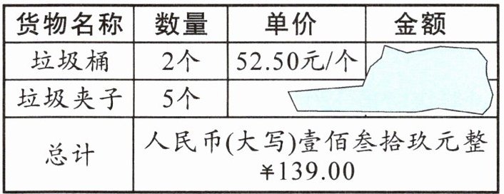 3. 光明小学五(3)班为了响应“垃圾分类你我行,共建绿色好校园”的号召,在网上采购了一批物品,但购物小票不小心被墨汁污损了,你能算出每个垃圾夹子多少钱吗?