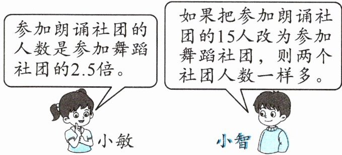 解析 本题的等量关系是:原来参加朗诵社团的人数-15=原来参加舞蹈社团的人数+15。设原来参加舞蹈社团的有x人,那么根据“参加朗诵社团的人数是参加舞蹈社团的2.5倍”可知,原来参加朗诵社团的有2.5x人。根据等量关系可以列出方程2.5x-15=x+15,解方程可以得到x=20,所以原来参加舞蹈社团的有20人。