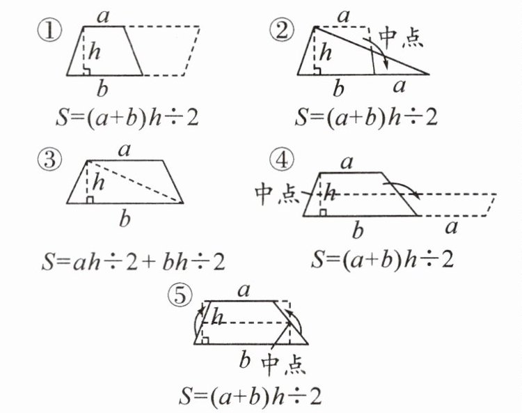 (1)下面是五种探究梯形面积公式的方法,其中正确的有( )。