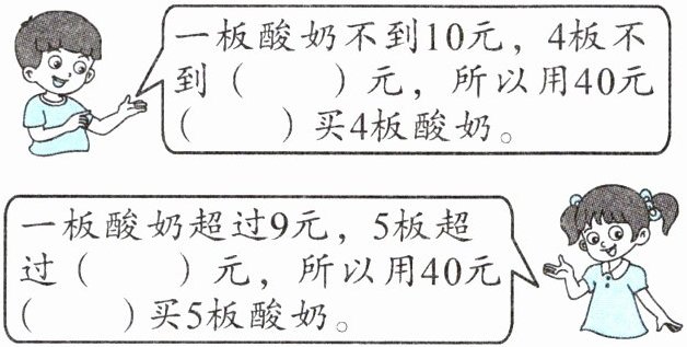 一板酸奶不到10元,4板不到( )元,所以用40元( )买4板酸奶。