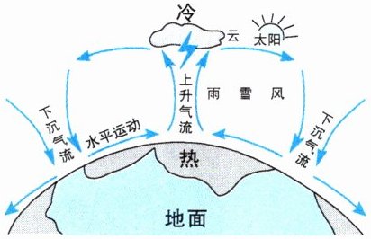 大气是指在地球周围聚集的一层很厚的大气分子,称之为大气圈。大气的运动变化是由大气中热能的交换所引起的,热能主要来源于太阳,热能交换使得大气的温度有升有降。世界气象组织把大气层分为五层,自下而上依次是:对流层、平流层、中间层、热层和外逸层。对流层是地球大气中最低的一层,风雨雷电等主要大气现象都出现在此层。